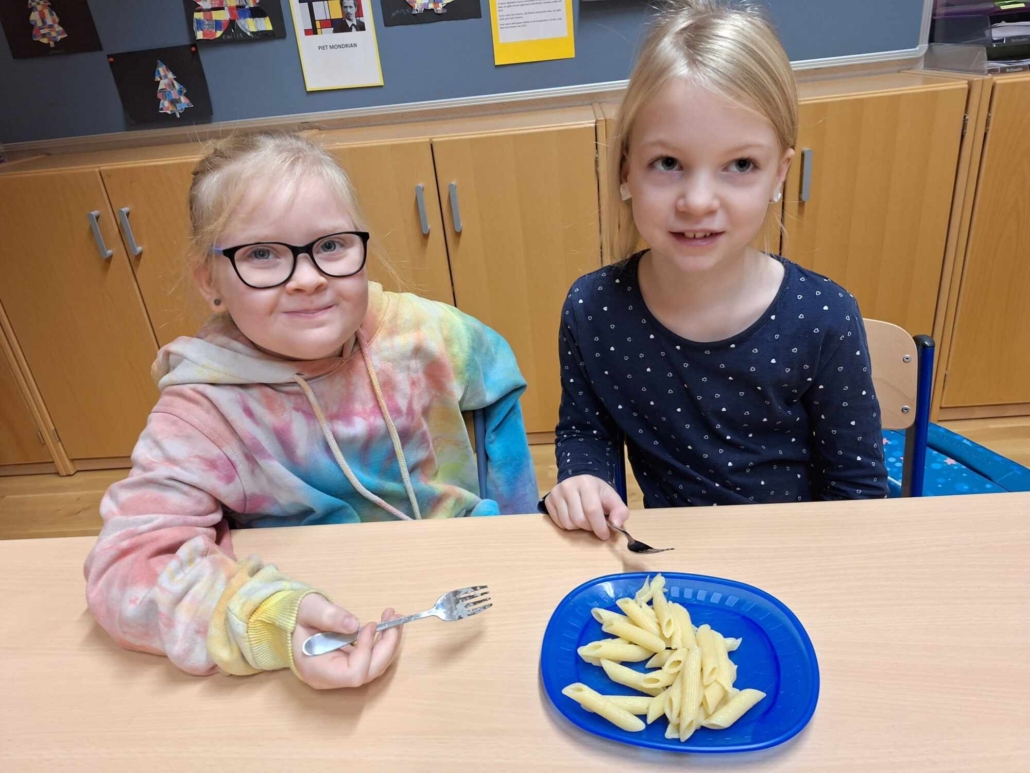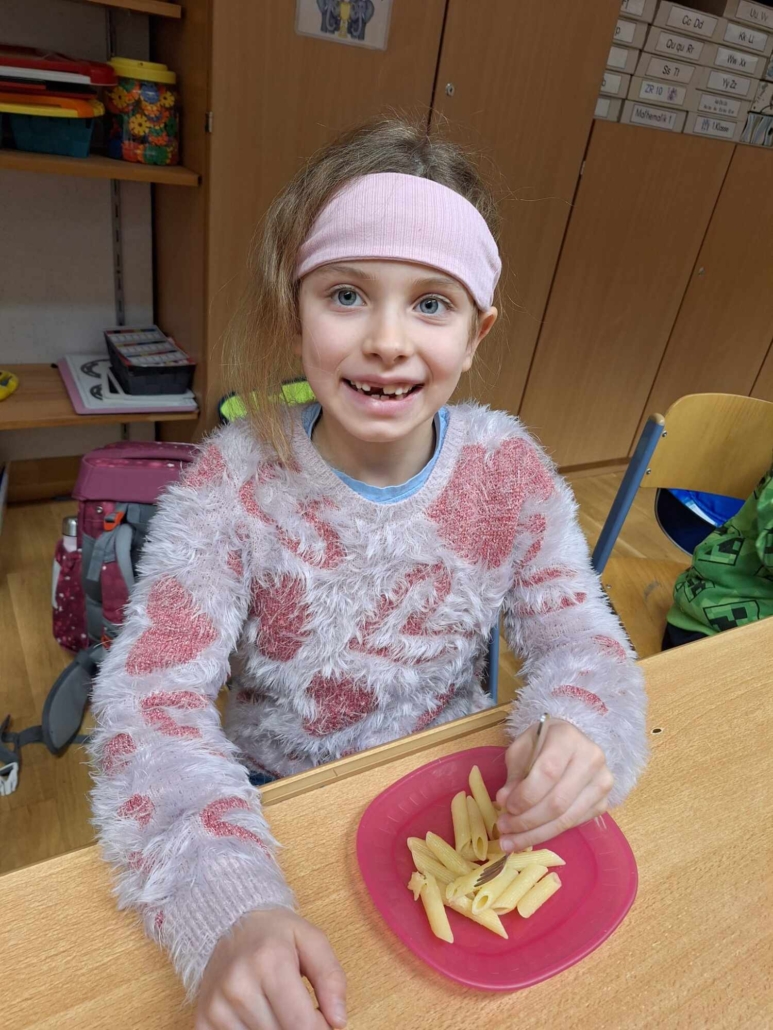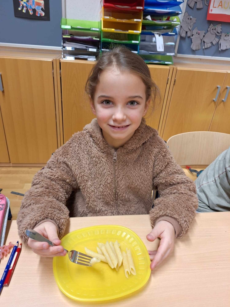 Im Rahmen der Buchstabenerarbeitung (N) kochten die Kinder der 1b Klasse gemeinsam Nudeln. Mit viel Freude und Teamarbeit bereiteten sie das Essen zu und genossen anschließend die selbstgekochten Nudeln. So wurde der neue Buchstabe mit allen Sinnen erlebt und nachhaltig gefestigt.