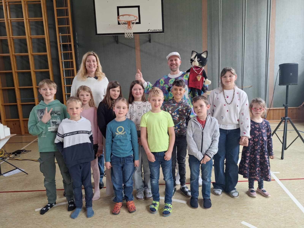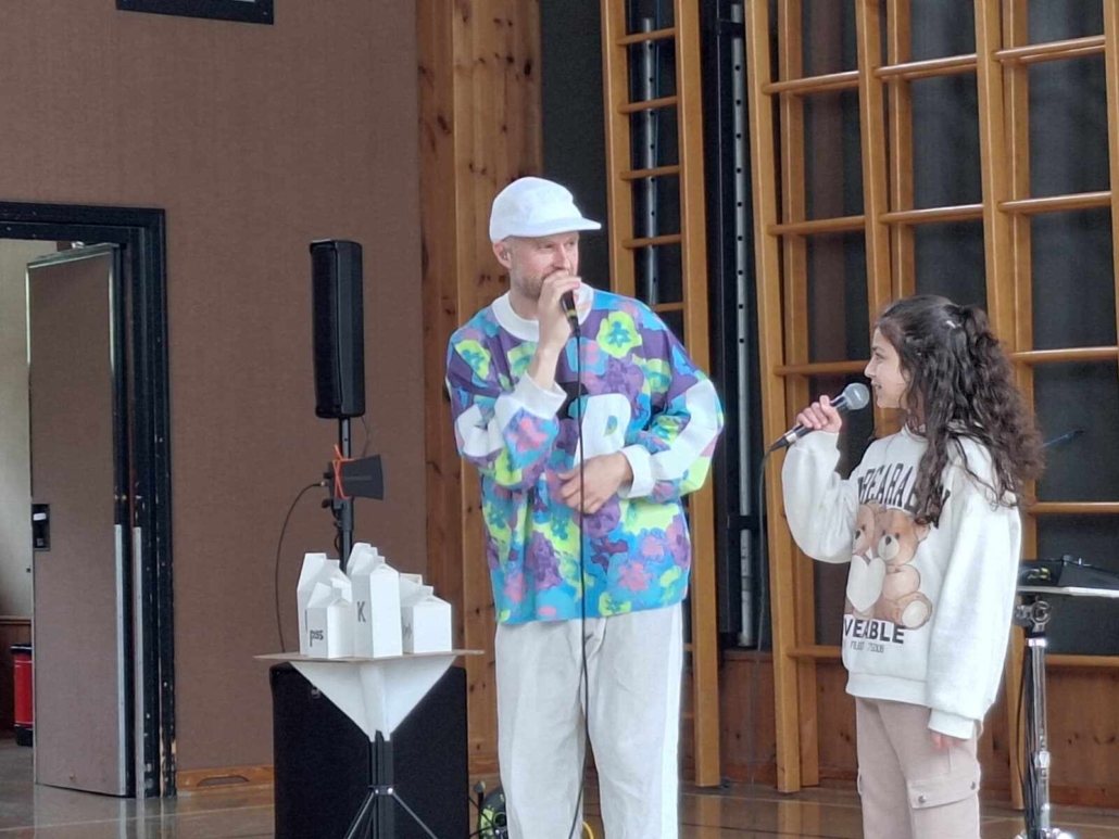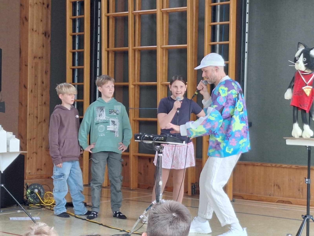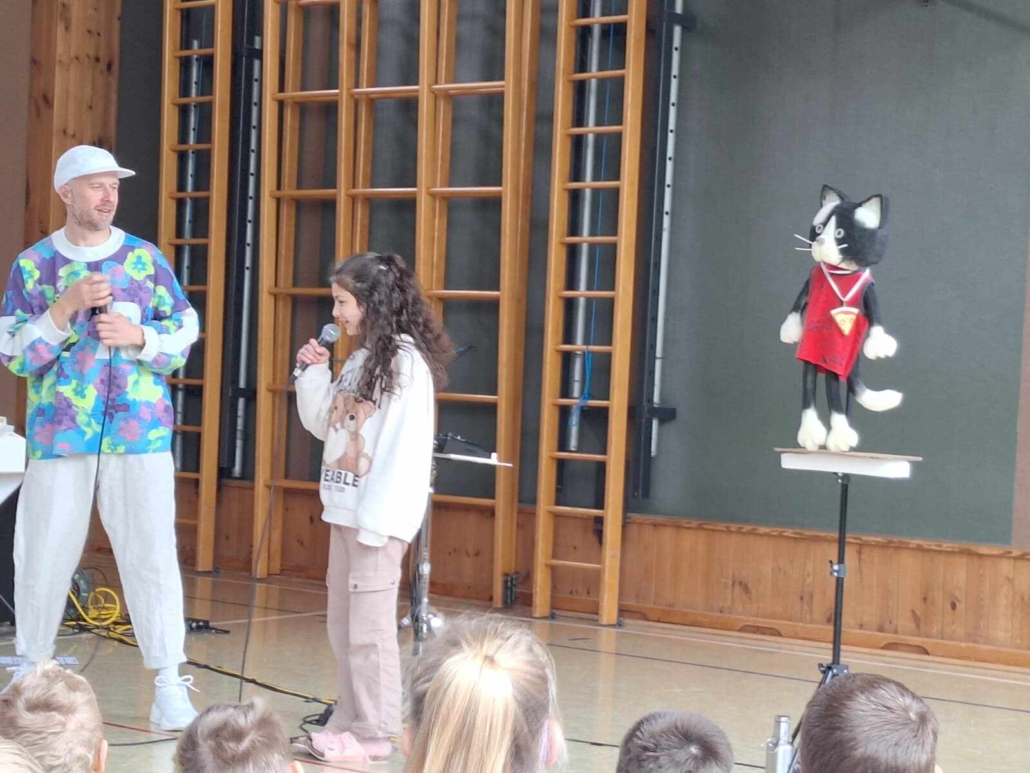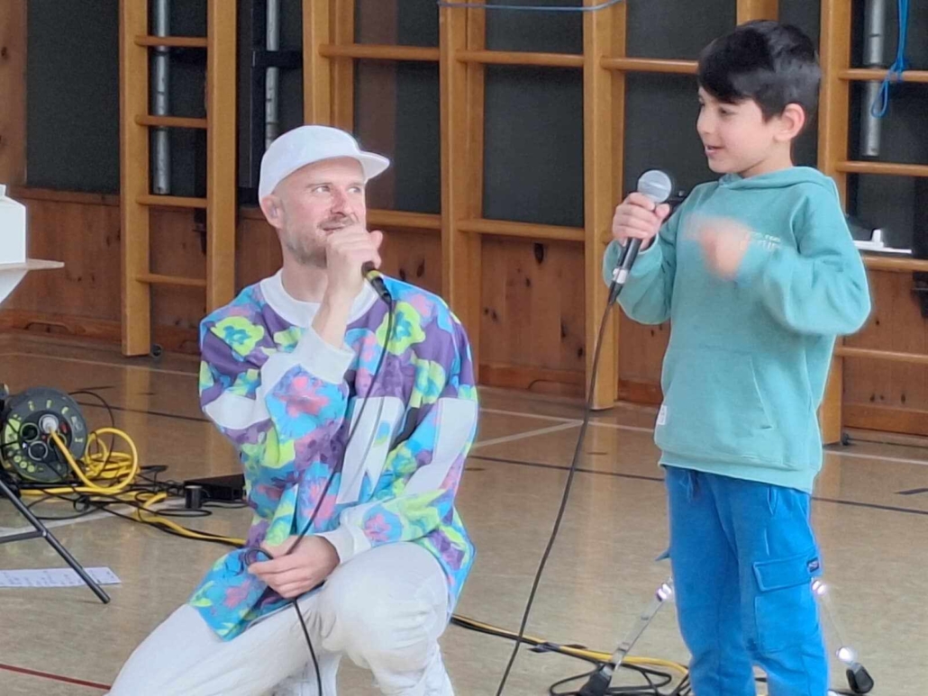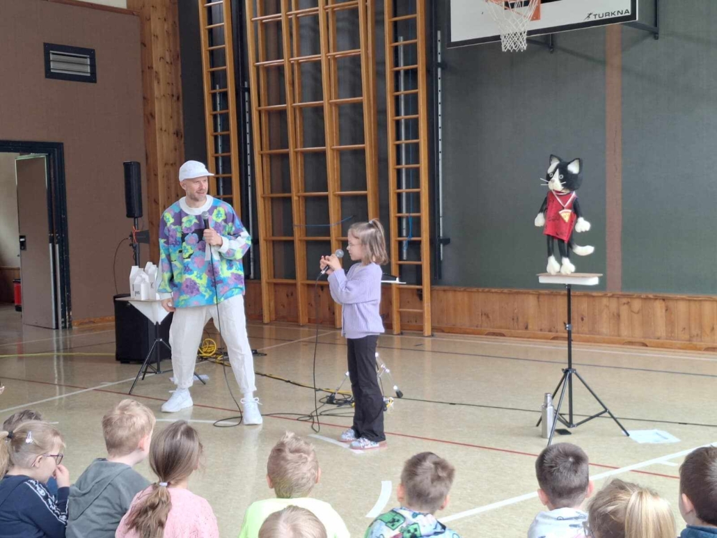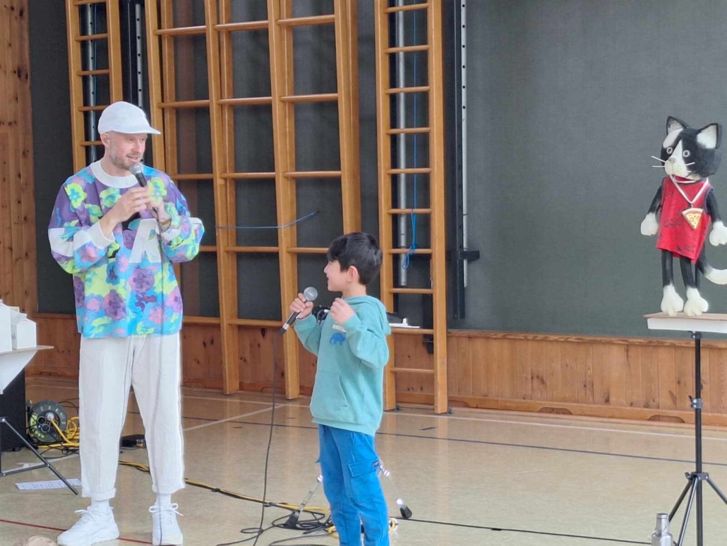 In der Show „Pizza Katze“ wurden alle Kinder sowie auch die Lehrpersonen dazu animiert, mitzutanzen, einzelne Beatbox-Sounds und einfache Grooves nachzumachen und selbst zu erlernen.